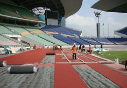 1、采用国-际田联认可的复合结构,上层为PU颗粒或EPDM耐候性环保彩色颗粒,渗水的聚氨酯密封,下层采用机械施工缓冲底垫,符合国-际比赛标准。