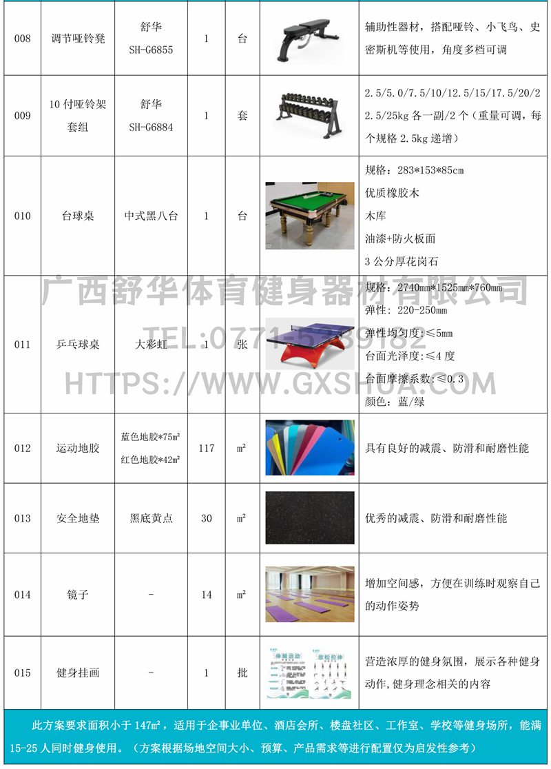 此方案要求面积小于147m²,适用于企事业单位、酒店会所、楼盘社区、工作室、学校等健身场所,能满15-25人同时健身使用。(方案根据场地空间大小、预算、产品需求等进行配置仅为启发性参考)